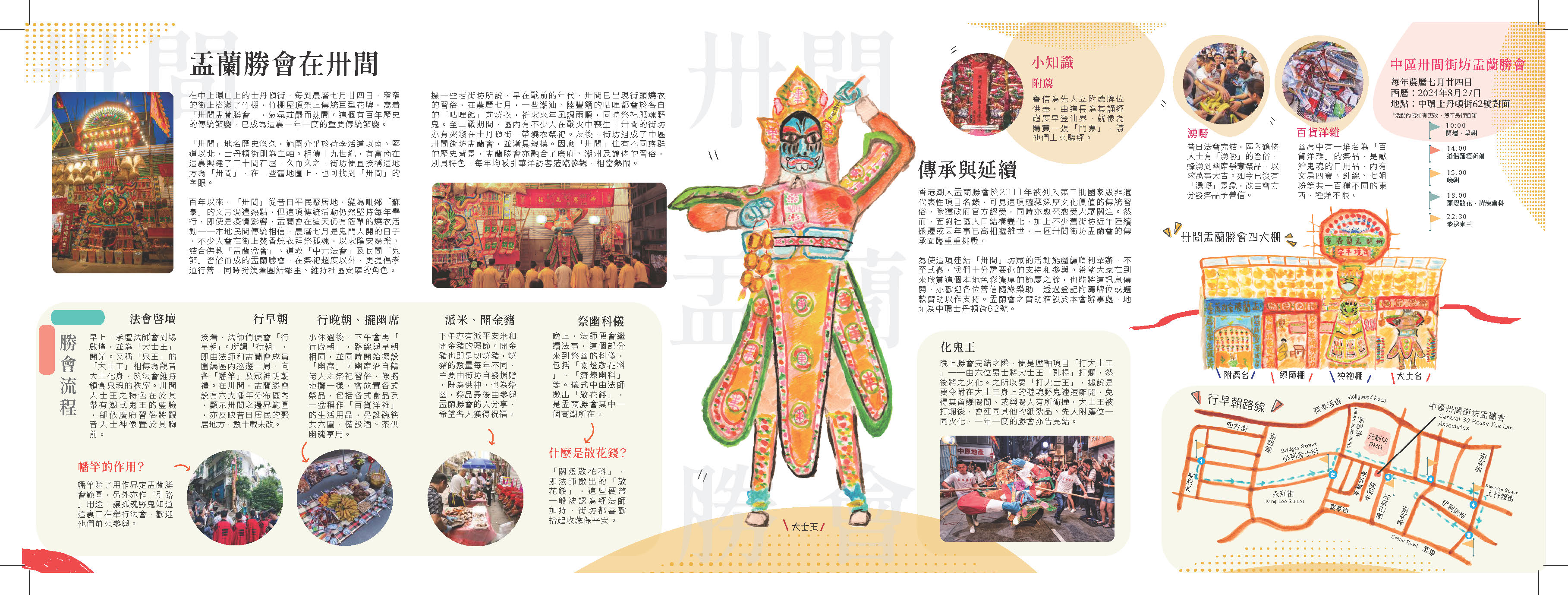 疫情過後,2024年,卅間盂蘭勝會事隔四年後復辦,作為中上環重要的傳統活動,獅子頭文化工作室全力支持,為這項非物質文化遺產策劃刊物出版、展板介紹、產品設計,期望讓更多人認識卅間社區、讓這個百年傳統能延續下去。